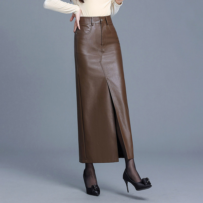 【四季可穿】韩系纯欲性感OL高腰显瘦前开叉中长款pu皮包臀半身裙