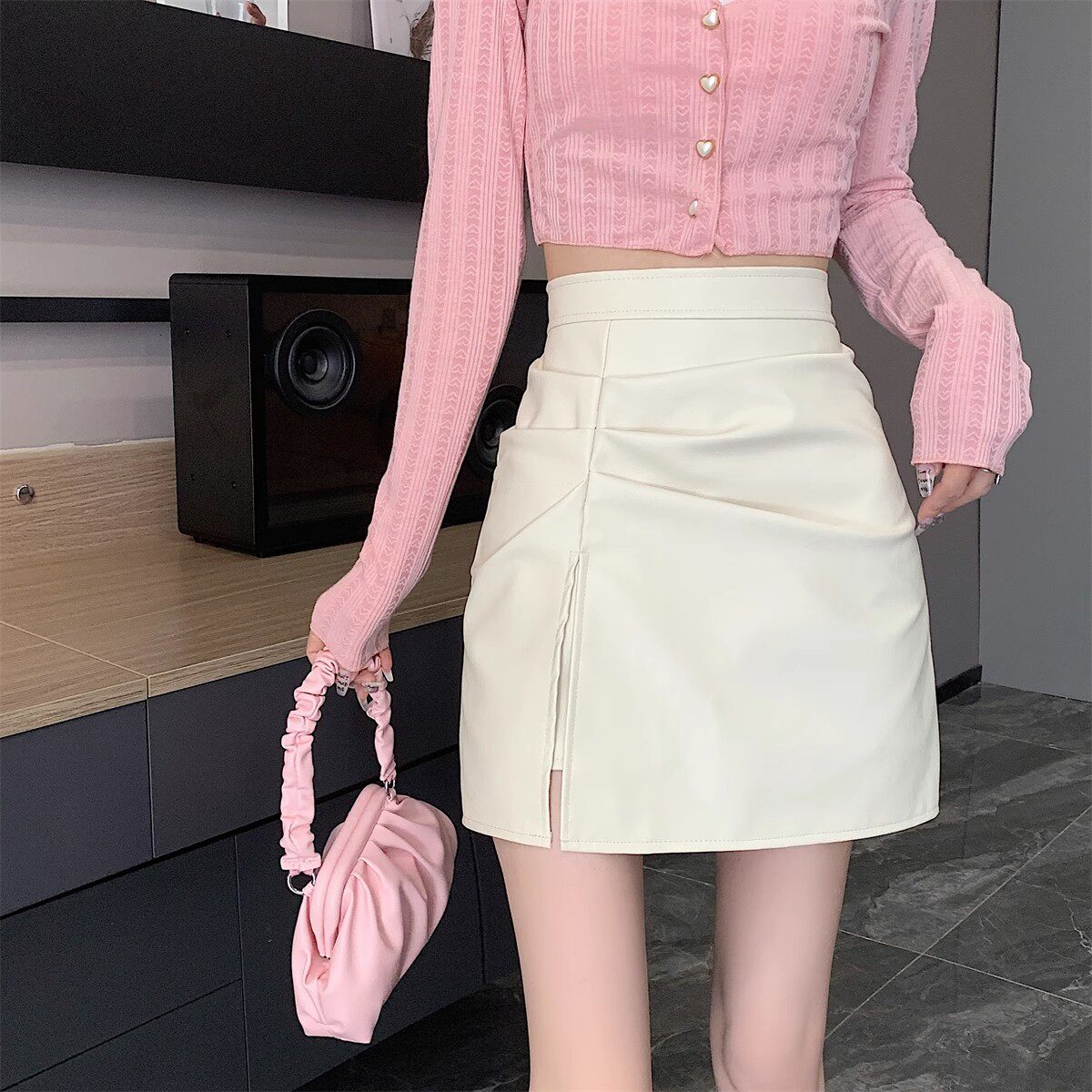 高腰开叉pu皮裙女秋季新款遮胯显瘦短裙性感辣妹a字包臀半身裙子