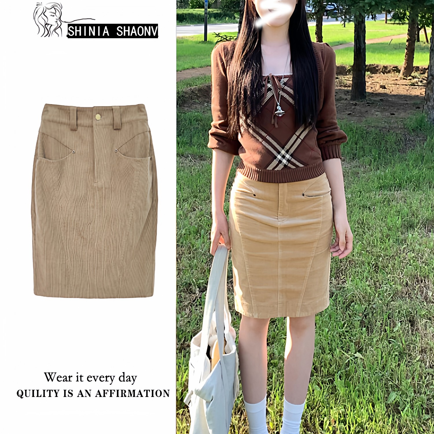 高级感复古气质灯芯绒半身裙女卡其色性感包臀中裙修身后开叉裙子