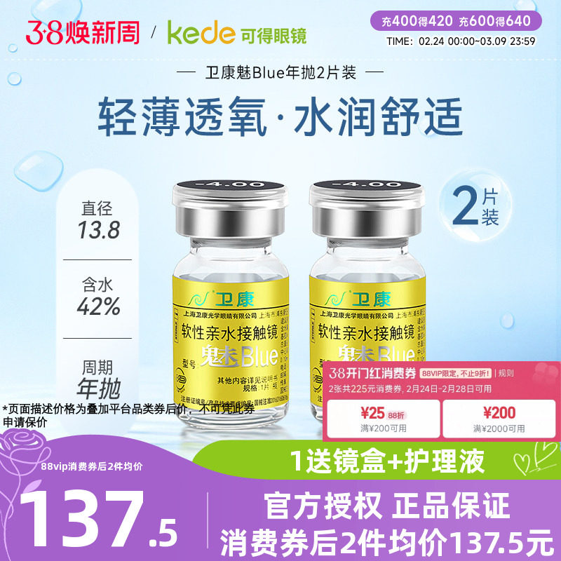 卫康隐形近视眼镜年抛盒2片魅blue金装高度数官方旗舰店正品包邮