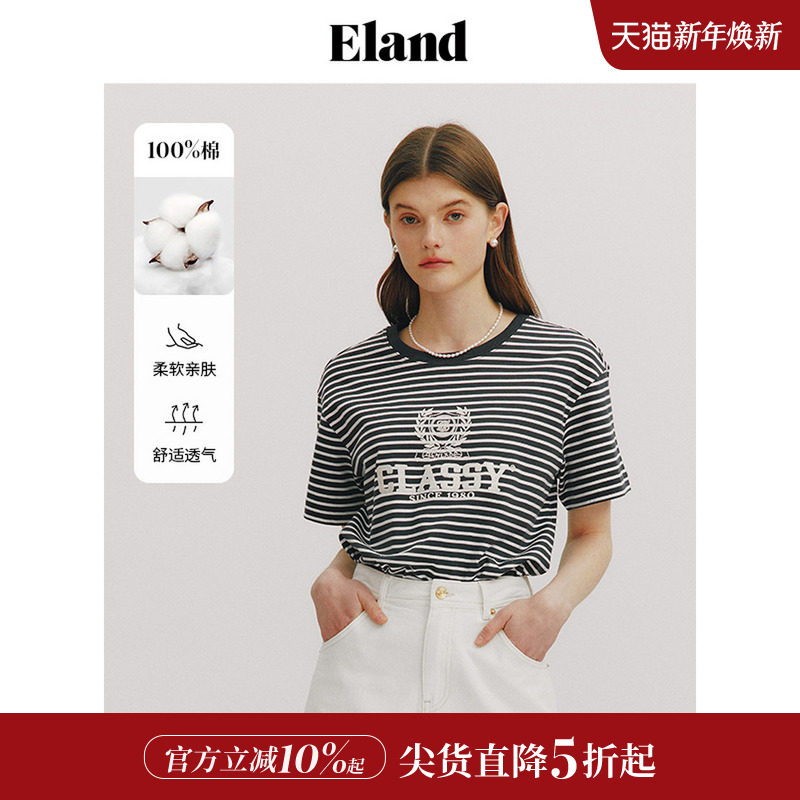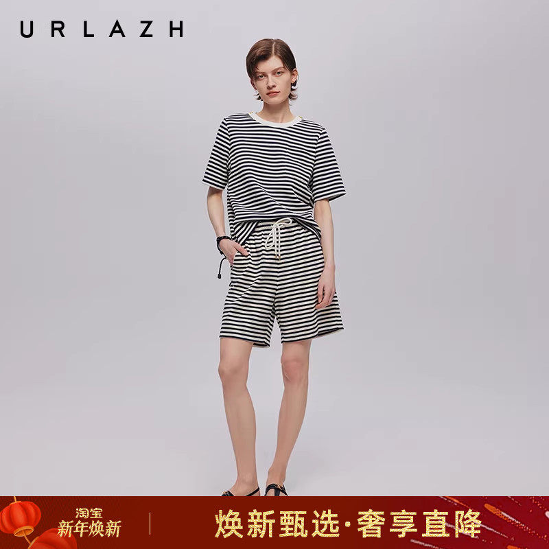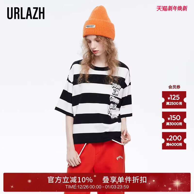 URLAZH有兰春秋新款宽松休闲黑白条纹圆领时尚针织短袖T恤女