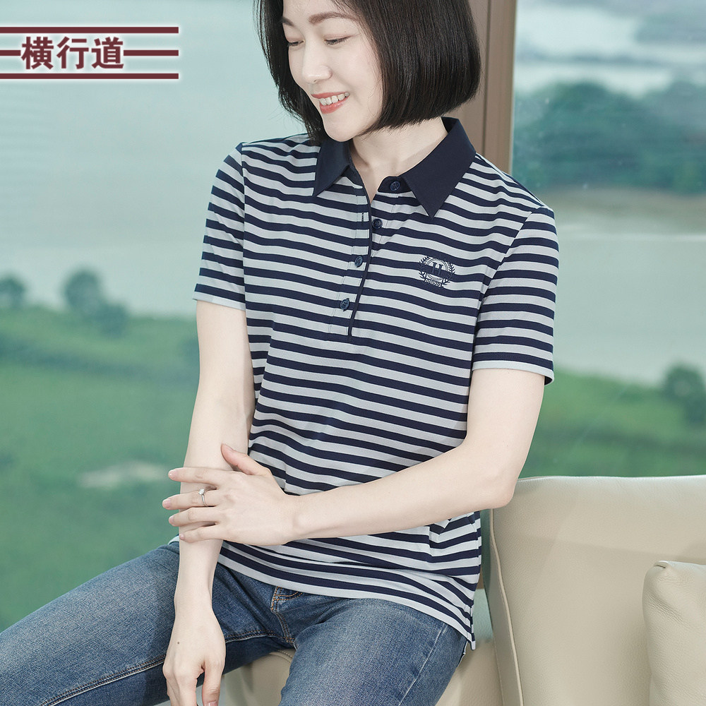 上衣刺绣t恤女装翻领黑白条纹宽松短袖2025夏装新款打底衫半袖