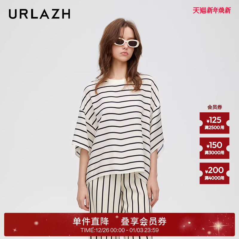 URLAZH有兰新款简约气质休闲宽松舒适黑白条纹廓形落肩短袖T恤女