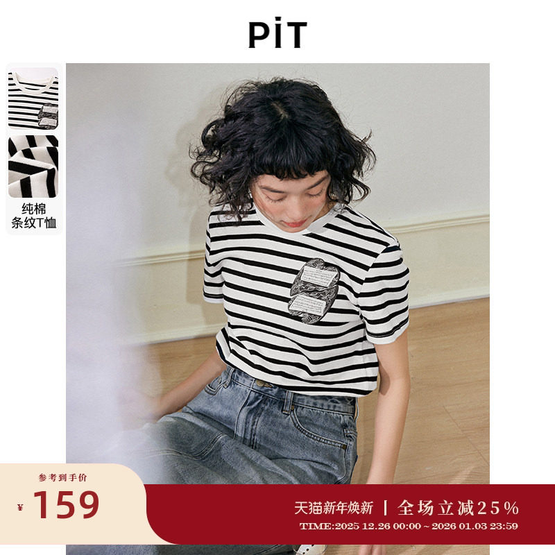 PIT复古设计感黑白条纹爱心印花T恤女夏新款宽松圆领短袖上衣
