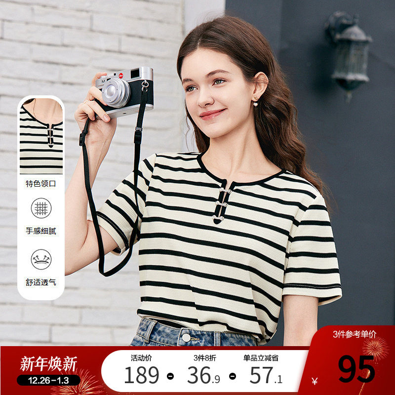 MULVAN 尼斯周末 基础黑白条纹短袖T恤女夏宽松休闲显瘦针织上衣
