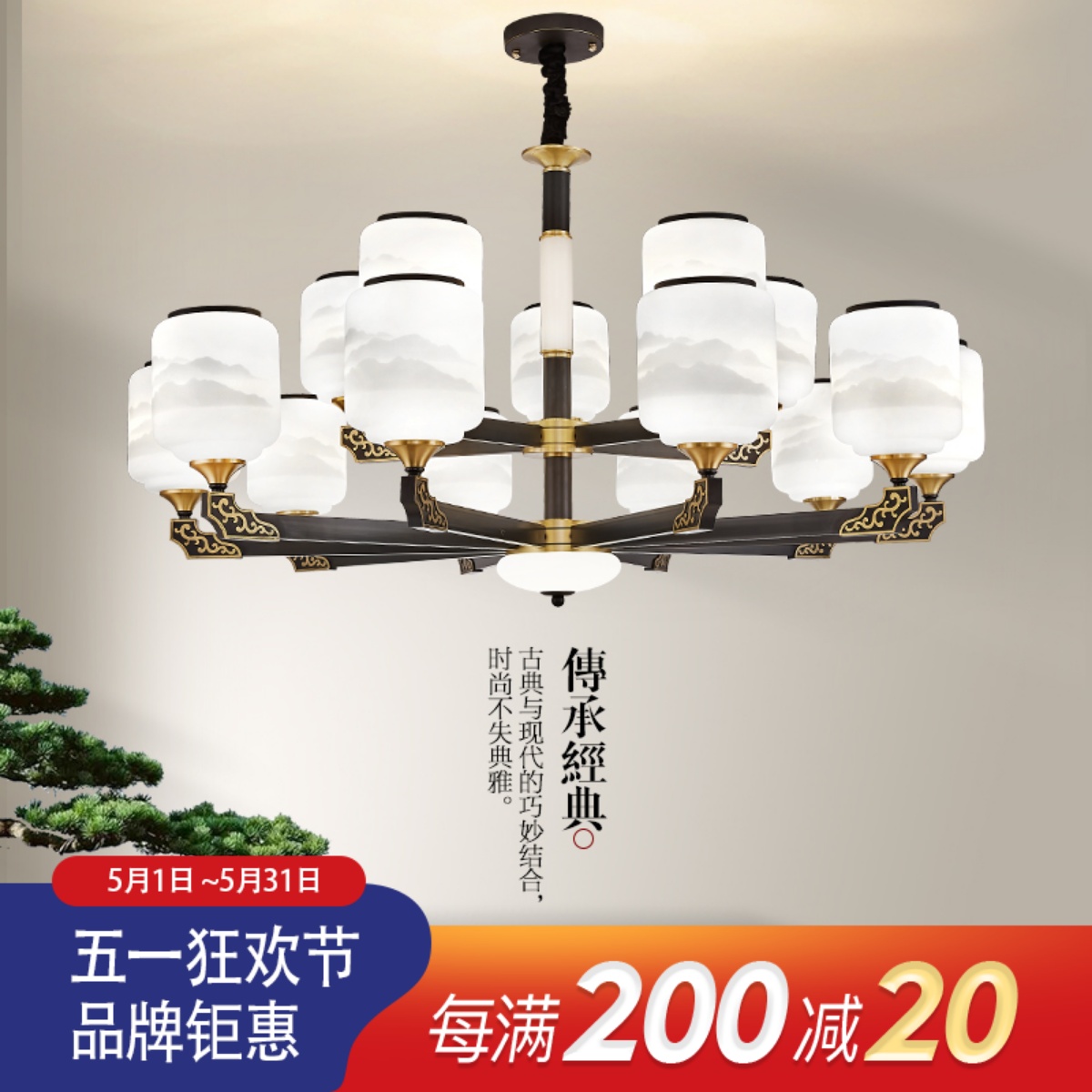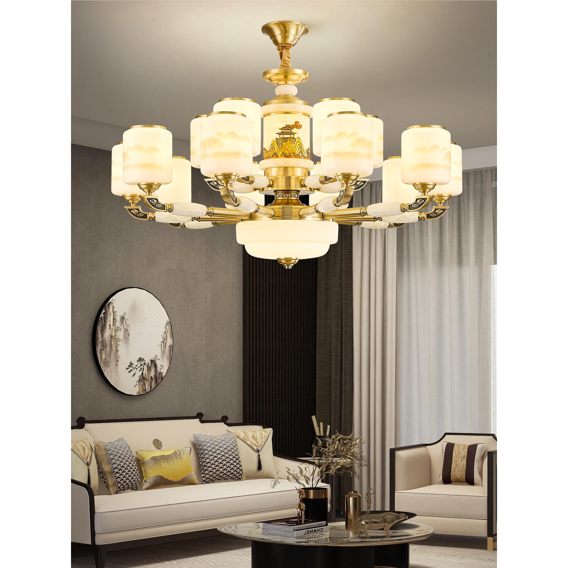 客厅吊灯新中式全铜玉石中国风大气主卧室别墅自建房大厅餐厅灯具