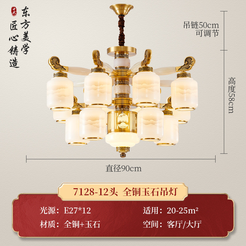 新中式全铜玉石吊灯客厅灯新x款简约现代中式别墅餐厅书房卧室灯