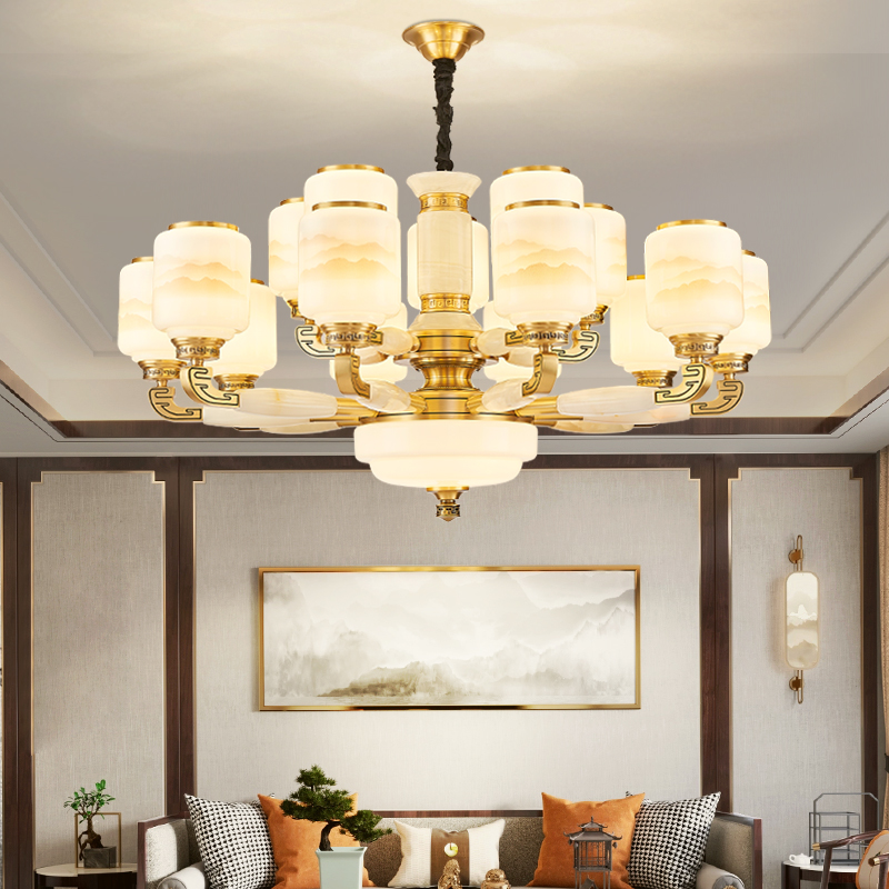 新中式全铜玉石吊灯客厅灯别墅复式楼大吊灯餐厅卧室书房中山灯饰