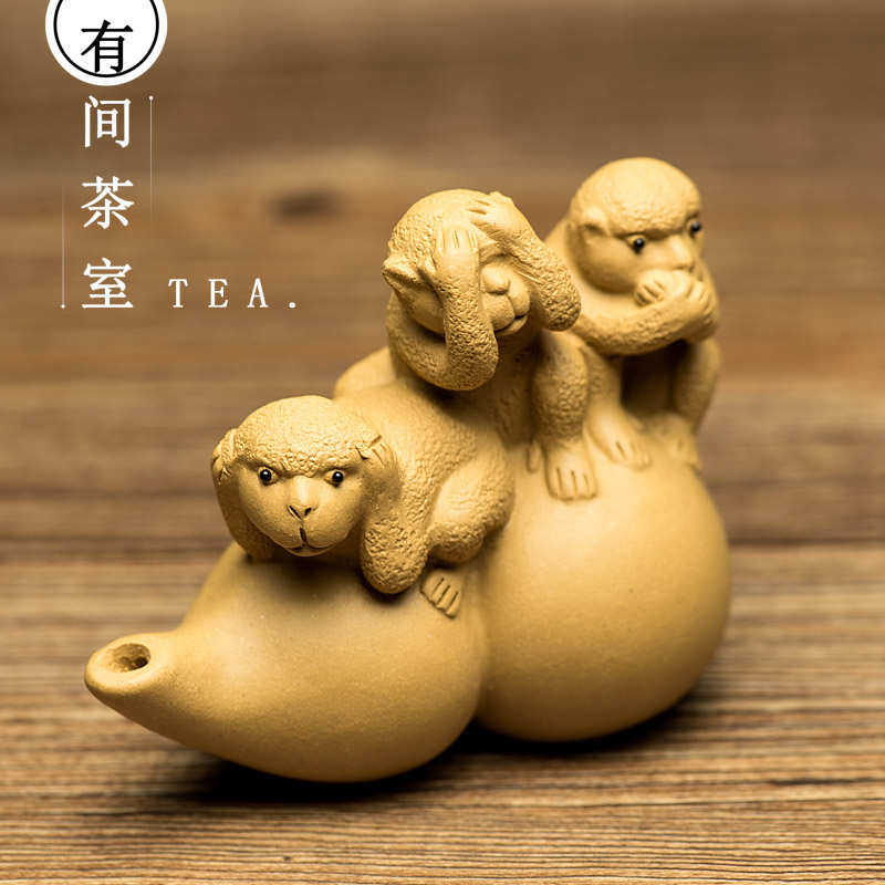 新款纪 手工三不猴子茶宠 创意仿古摆件茶道玩一不茶看不说铁壶铜