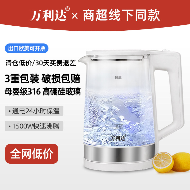 万利达316钢玻璃电热烧水壶家用大容量新款办公室全自动保温一体