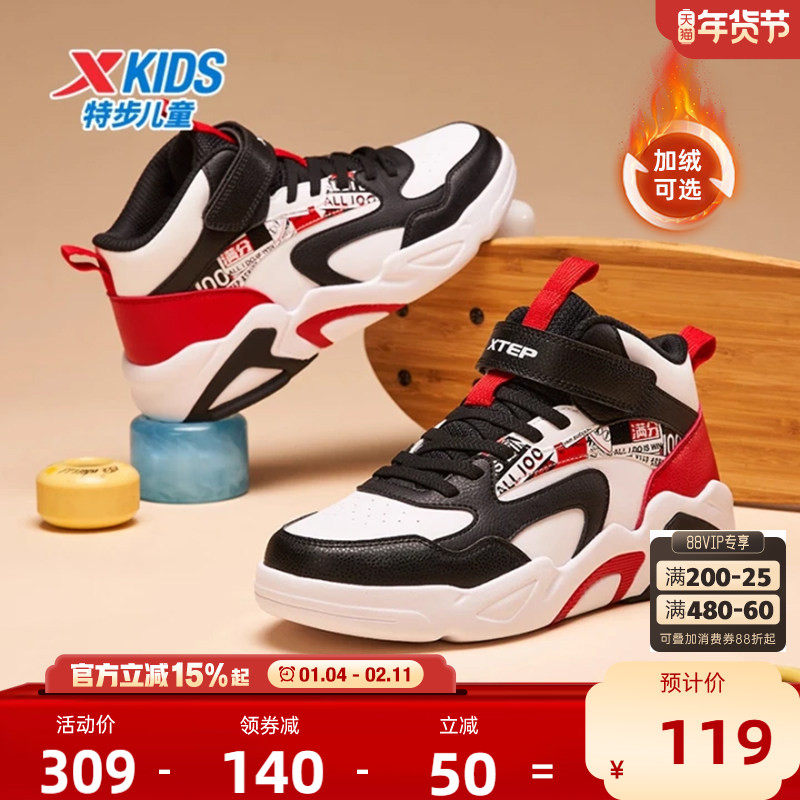 特步男童鞋加绒鞋冬季二棉鞋皮面鞋儿童中大童高帮保暖休闲运动鞋