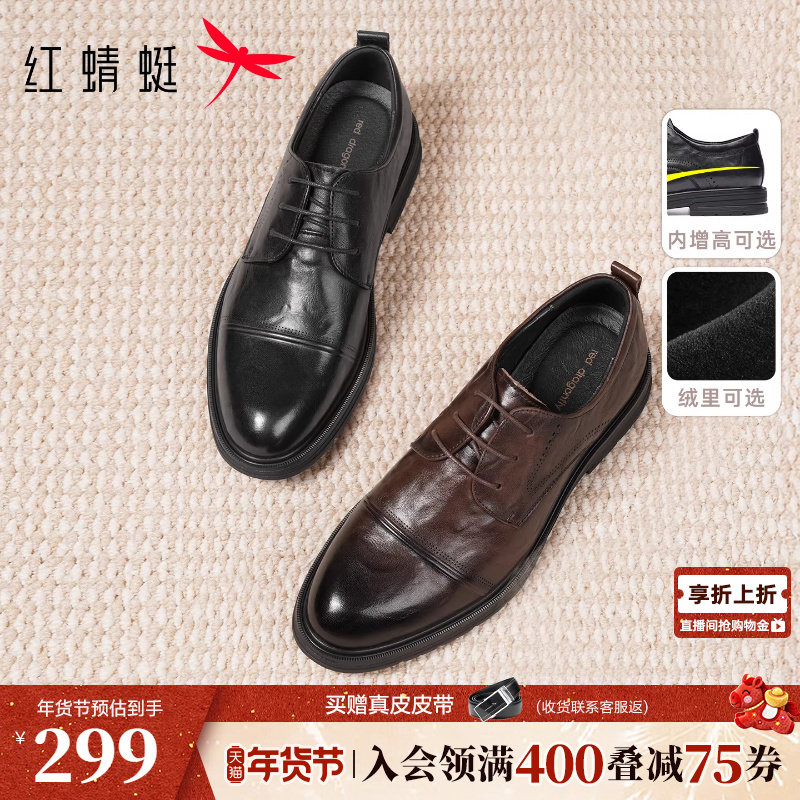 红蜻蜓皮鞋男款结婚新郎冬季真牛皮男士增高鞋三接头商务正装鞋子