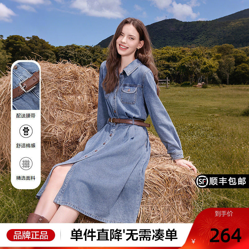 betu百图经典原色牛仔连衣裙女衬衫裙2025年秋季新款腰带中长裙