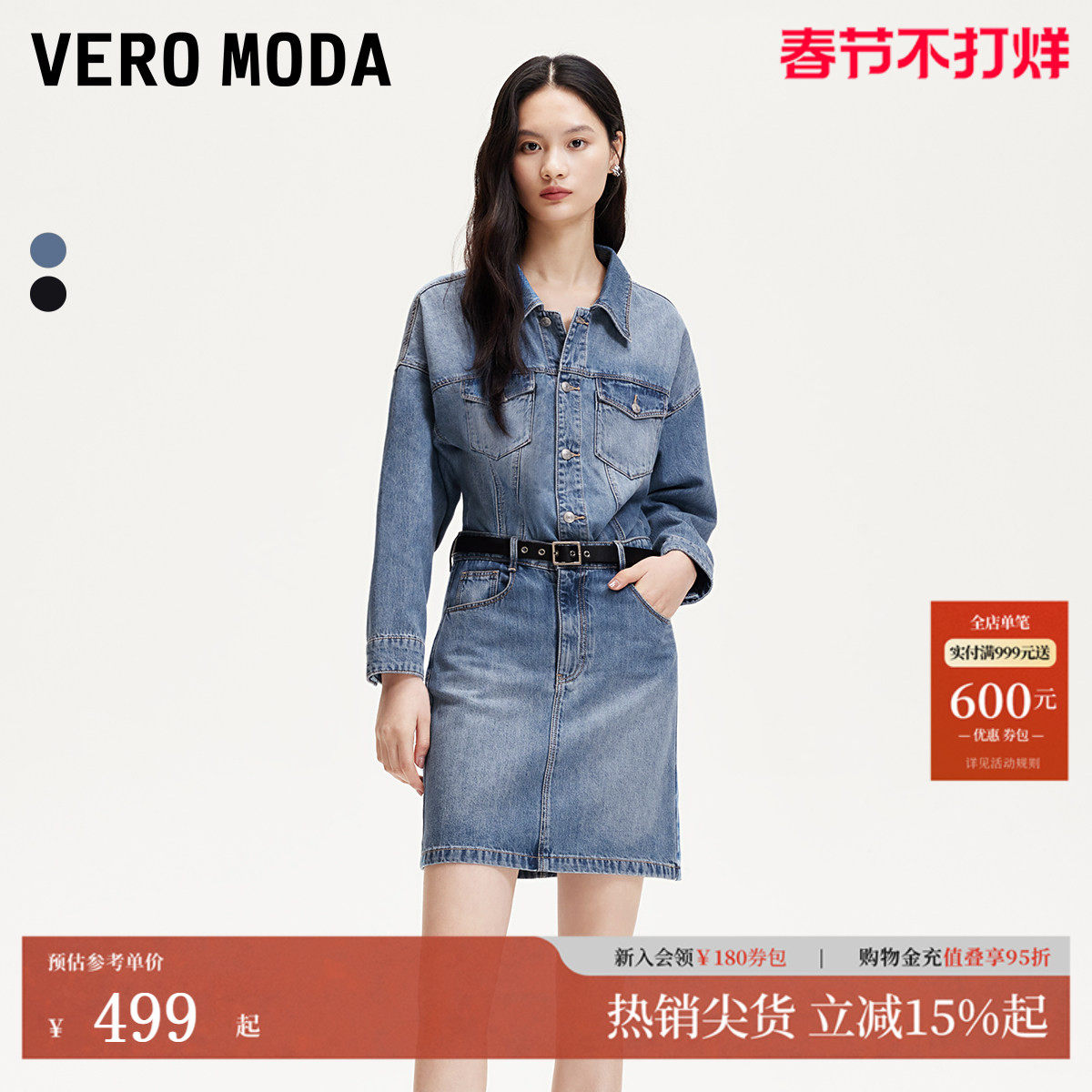 Vero Moda连衣裙女2025春季新款翻领落肩水洗牛仔中长裙时尚街头