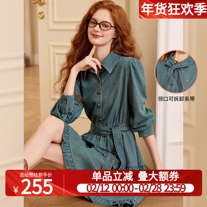 LANCY/朗姿2026春季新款优雅牛仔连衣裙收腰A字中长款气质裙子女