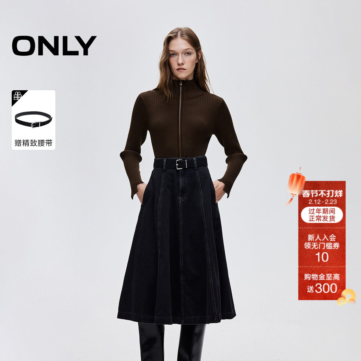 ONLY2026春季新款复古水洗通勤中长裙撞色针织拼接牛仔连衣裙女