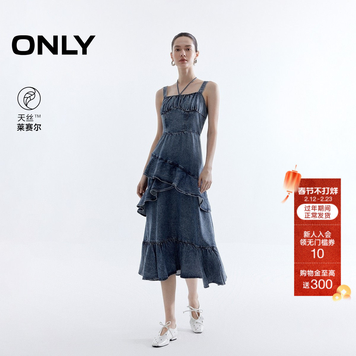 ONLY2026春季新款甜美优雅荷叶边中长款收腰牛仔吊带裙连衣裙女