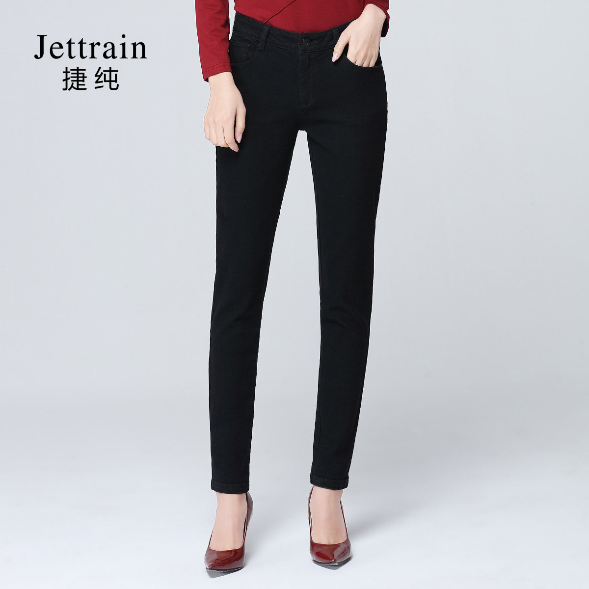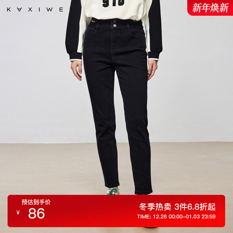 KZH真维斯黑色修身小脚裤女秋冬季新款弹力提臀高腰加绒牛仔长裤