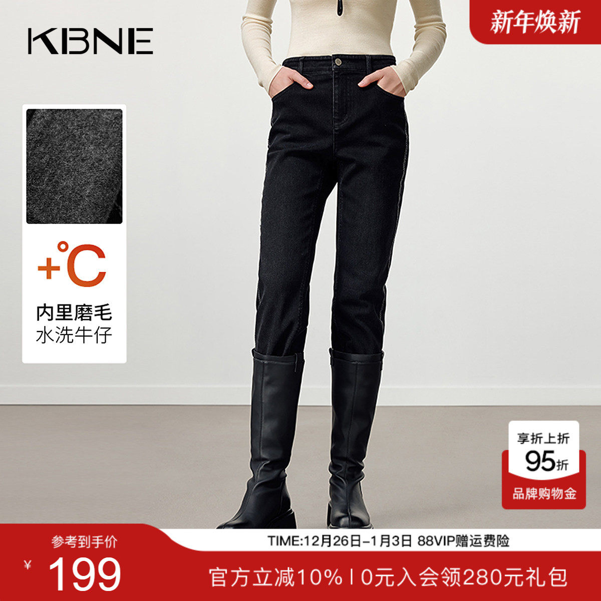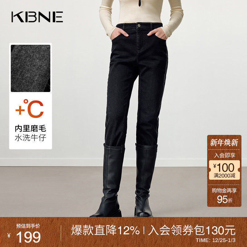 KBNE高弹磨毛水洗黑色牛仔裤女2025冬季新款小脚裤高腰显瘦长裤子