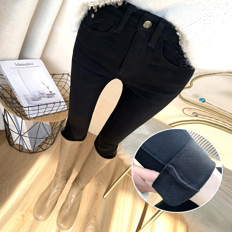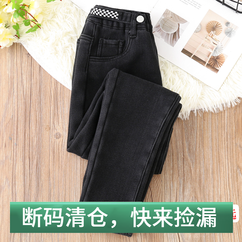断码清货女中大童秋冬洋气长裤黑色加绒软牛仔裤儿童高腰小脚裤子
