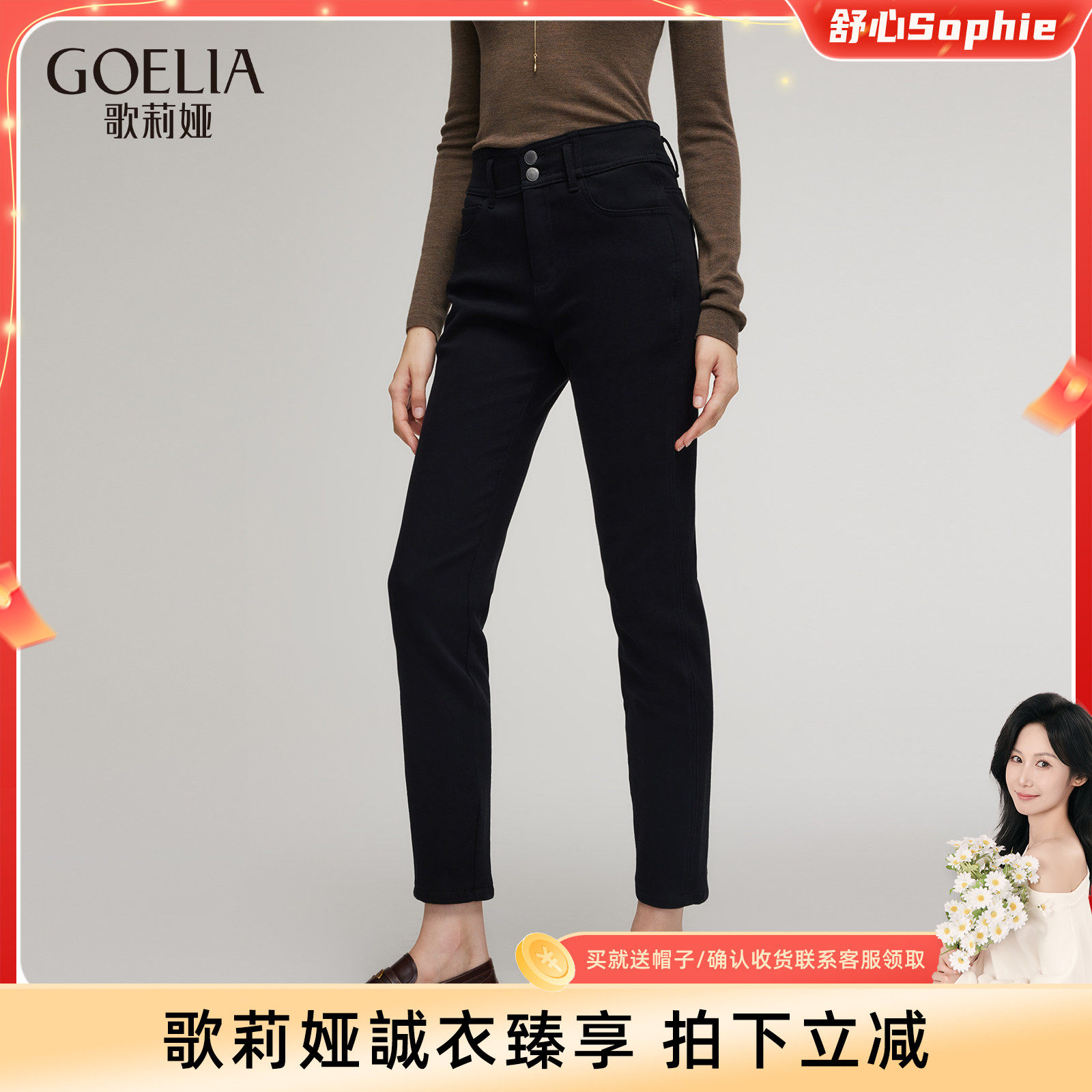 【舒心】歌莉娅黑色牛仔裤女秋冬穿搭靴裤暖姜高腰小脚裤保暖长裤