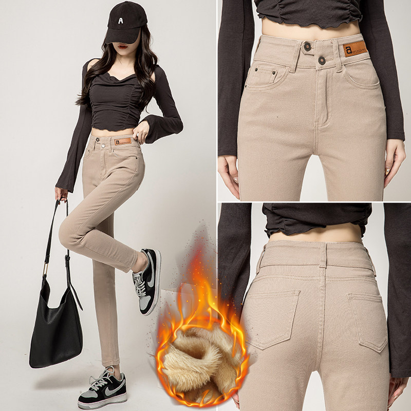 - 带绒牛仔裤女 高腰