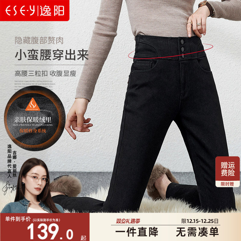 逸阳黑色高腰牛仔裤女加绒2025秋冬新款铅笔弹力显瘦加厚小脚长裤