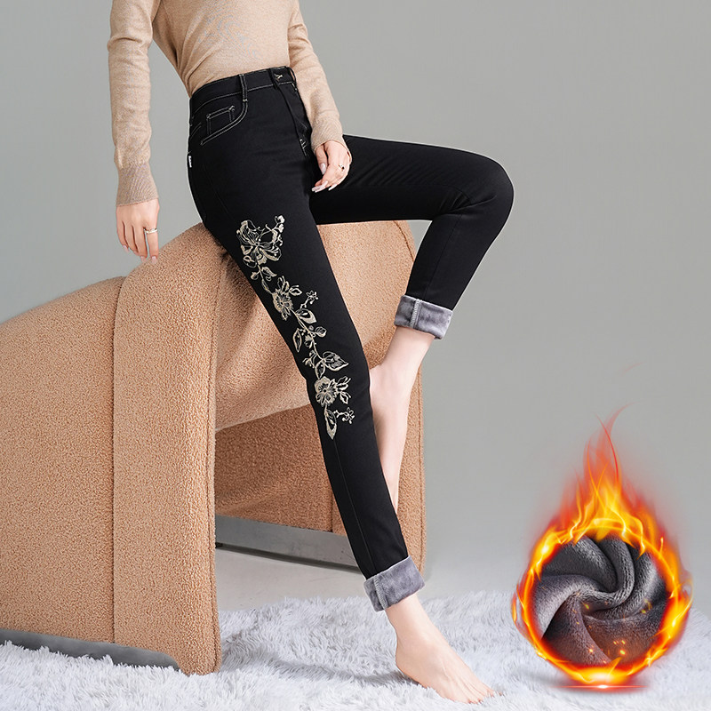 风姿歌2025新刺绣花高腰显瘦小脚牛仔女黑色冬季长裤加绒大码保暖