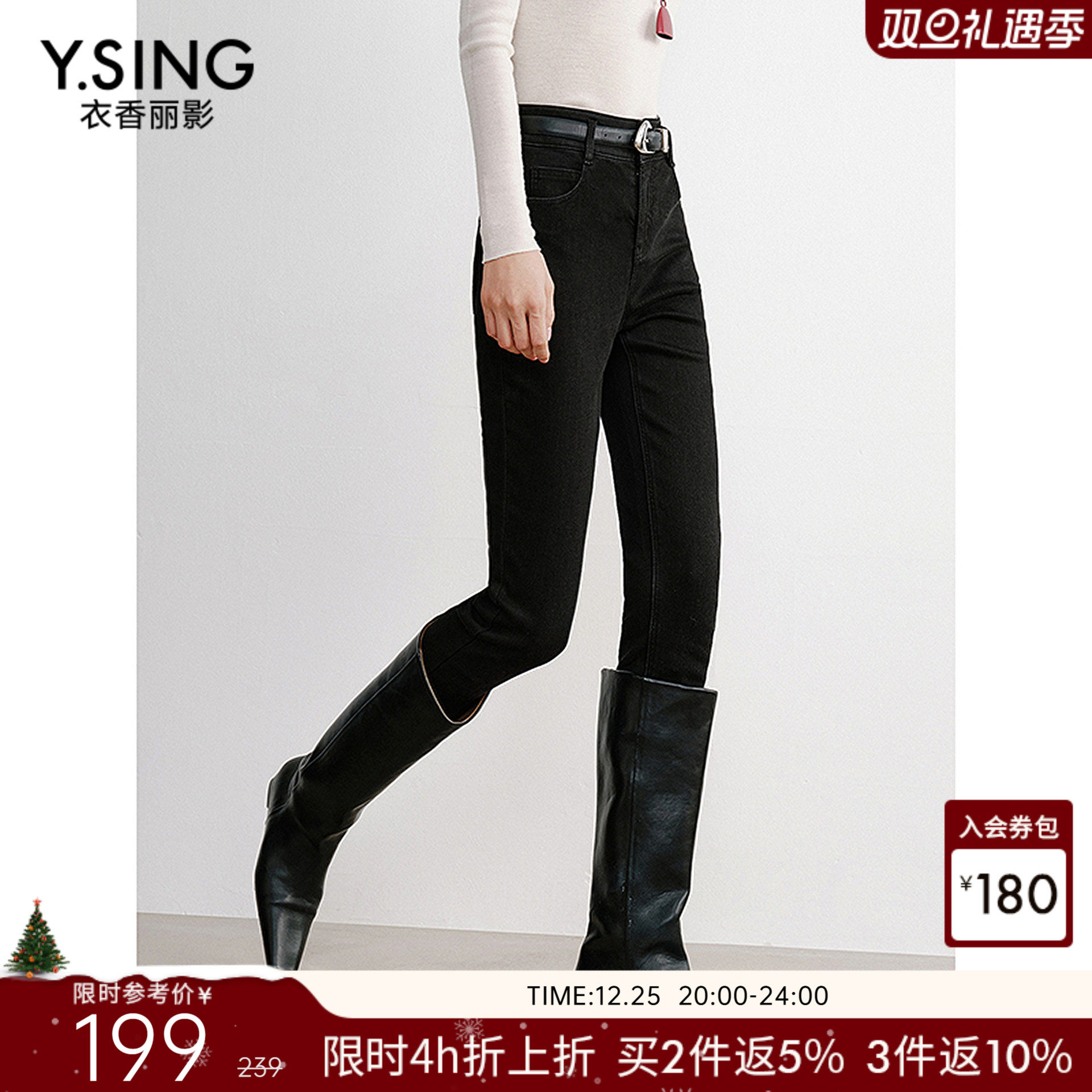 衣香丽影黑色加绒小脚牛仔裤女2025冬装新款高腰修身铅笔裤长裤子
