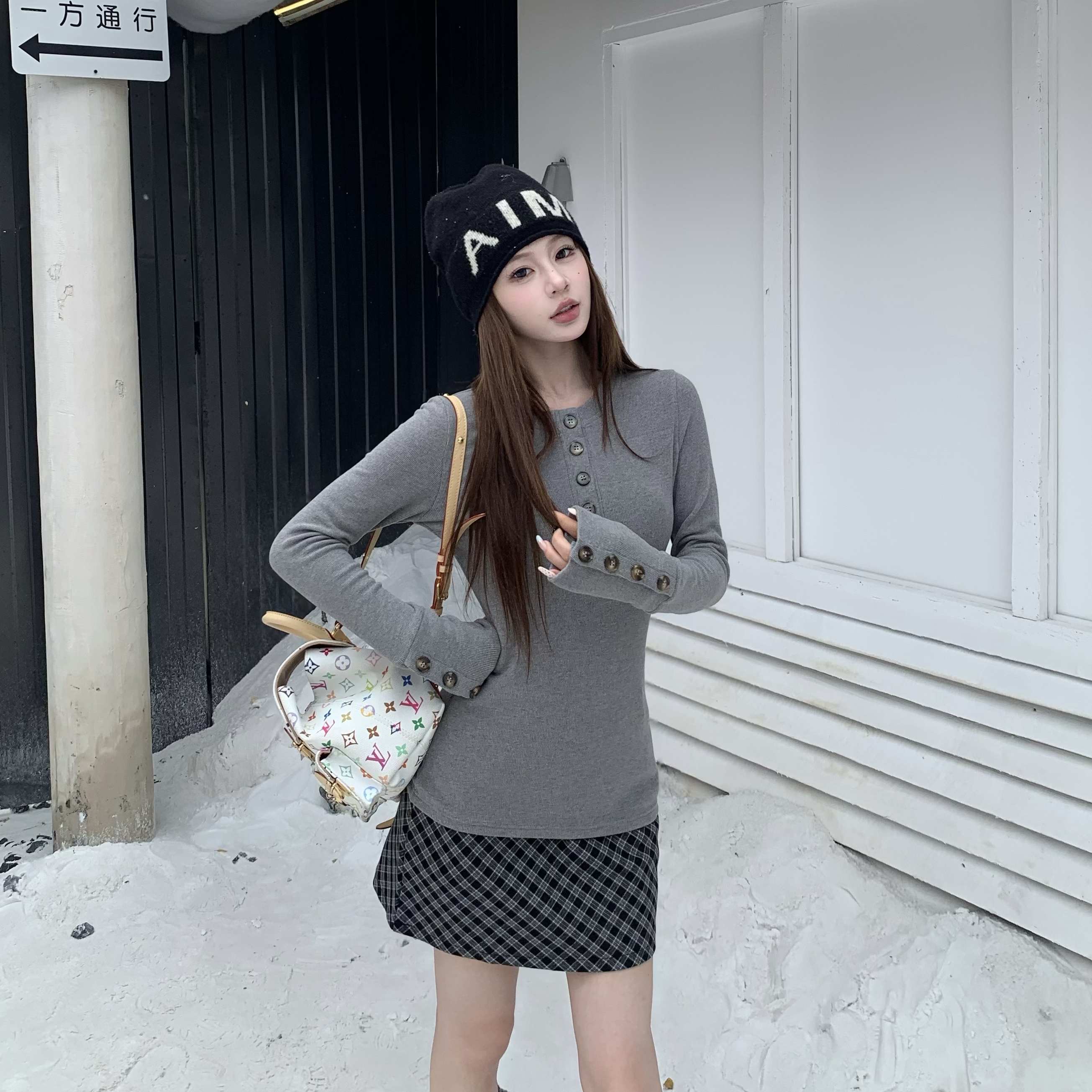 3MER哦哦三妹 灰色仿羊绒排扣内搭打底衫女秋冬季修身长袖T恤上衣