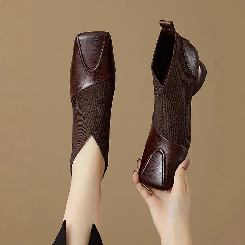 巨好穿法式深口单鞋女2025年春秋方头中跟粗跟真皮毛线口弹力短靴