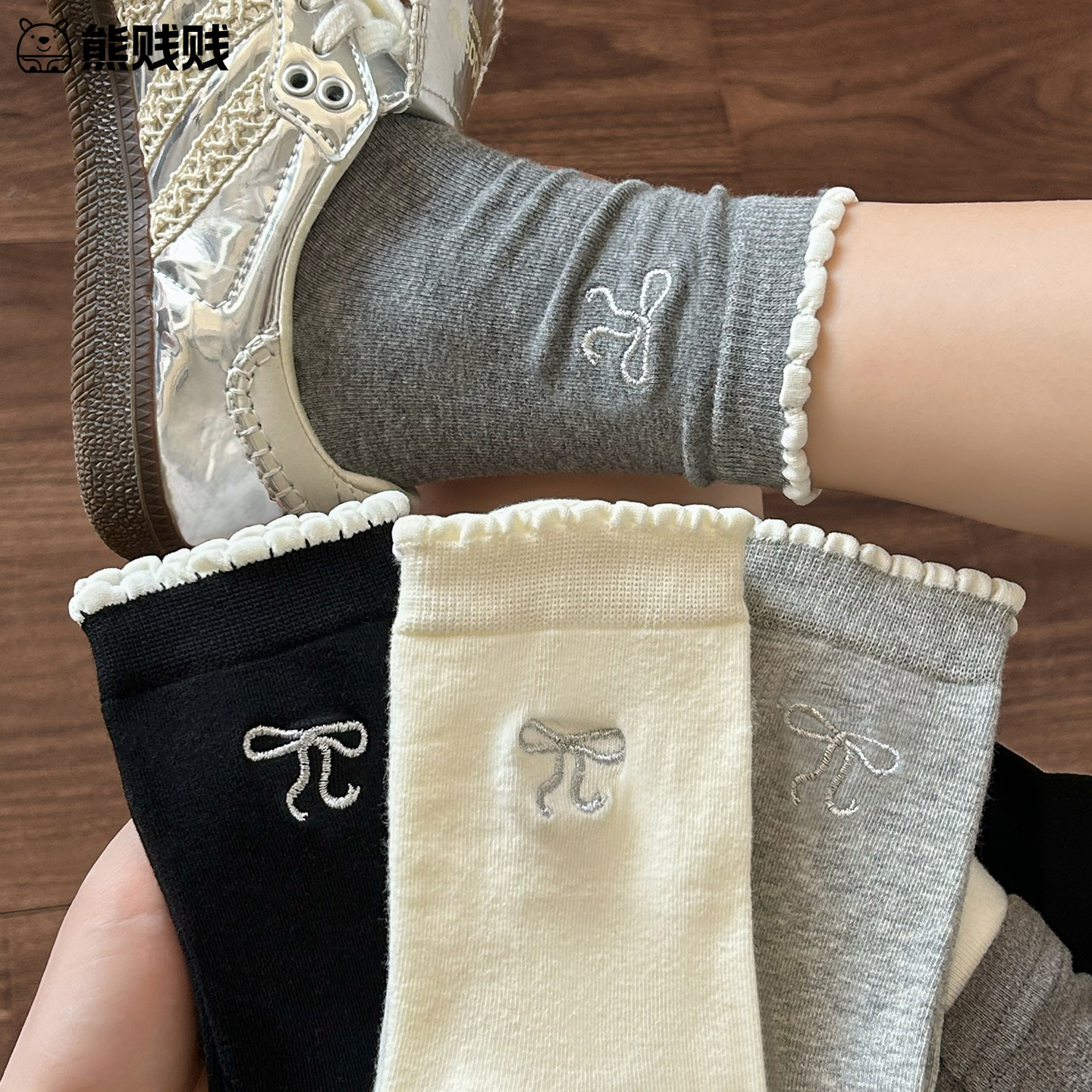 白色纯棉堆堆袜子女花边袜蝴蝶结刺绣无骨中筒袜灰色2026新款爆款