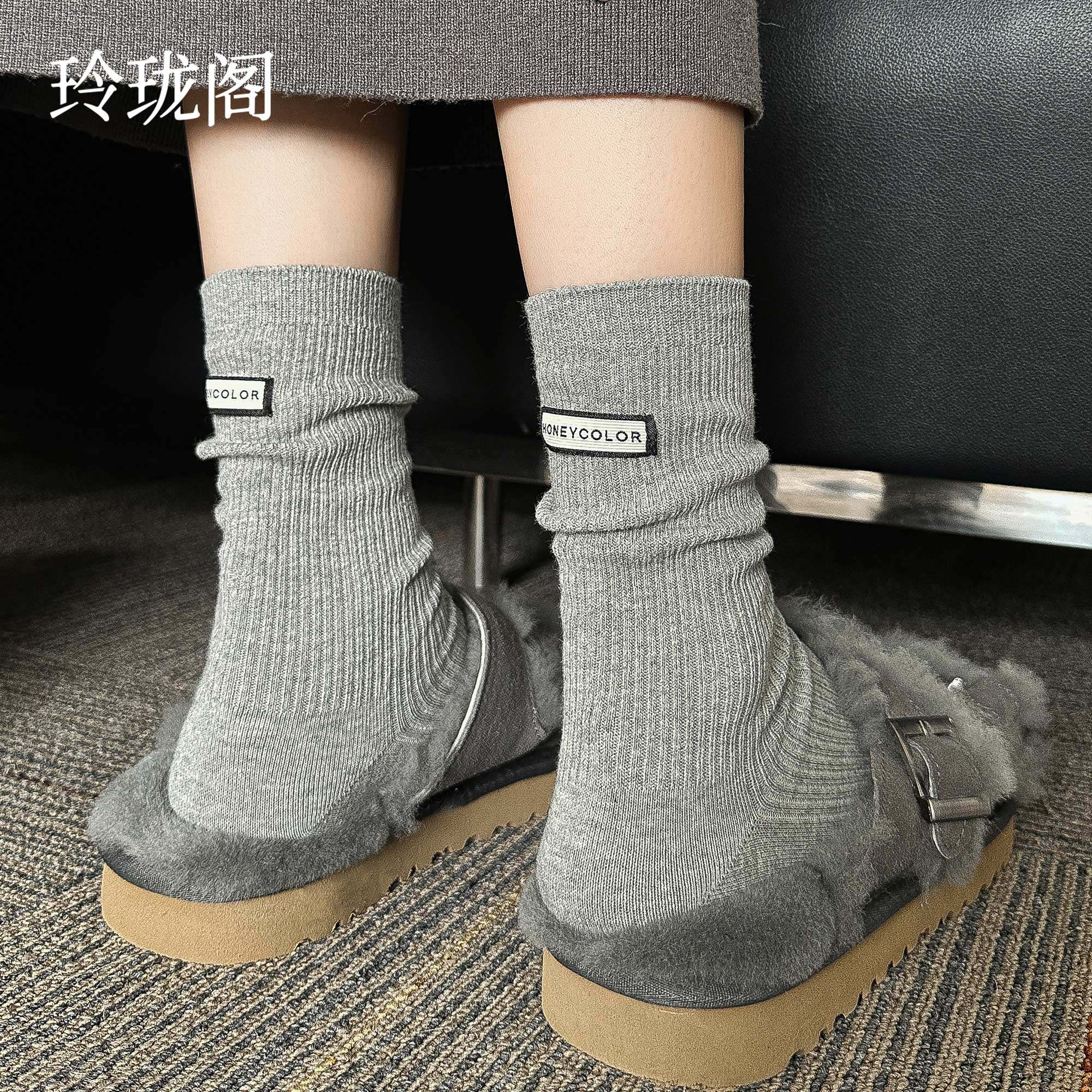 100%纯棉堆堆袜子女款春秋款中筒无骨月子袜冬季配勃肯鞋灰色长袜