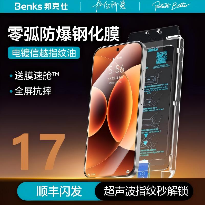 Benks零弧小米17promax钢化膜适用Xiaomi17pro手机保护por新款官超声波指纹解锁防摔十七pm高清无尘仓mi镜头p
