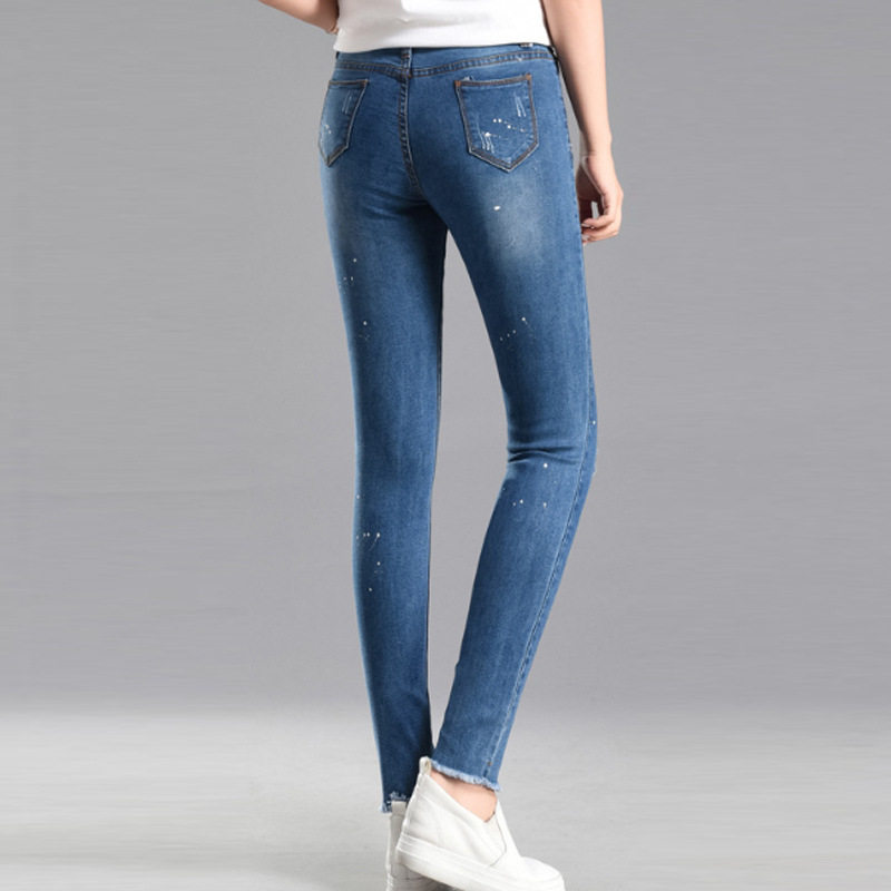 外贸原单牛仔裤女春秋弹力修身显瘦小脚铅笔裤磨破洞印花长裤大码