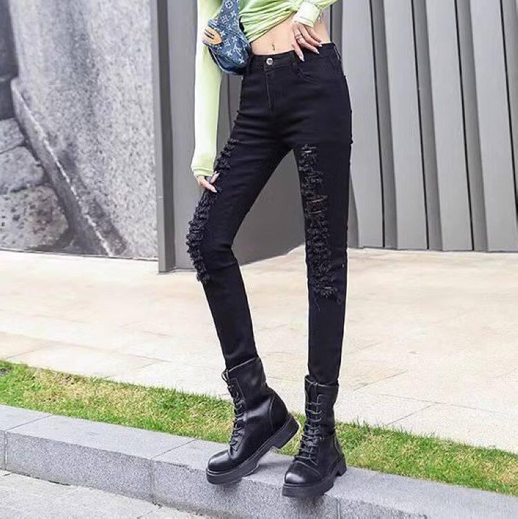 韩版休闲破洞牛仔裤2025春夏新款个性潮流女装修身显瘦铅笔裤长裤