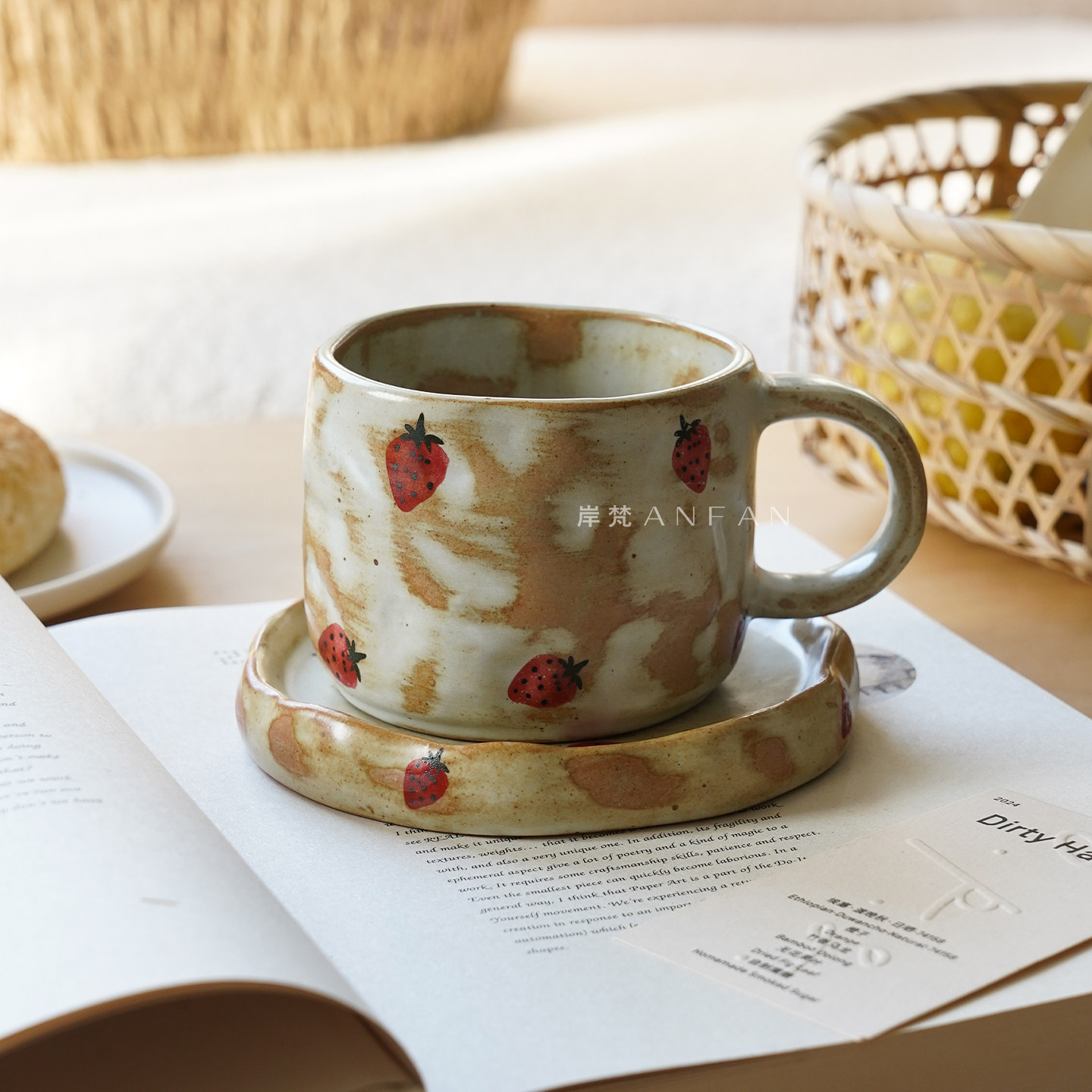 岸梵创意复古草莓咖啡杯可爱水杯陶瓷马克杯高颜值下午茶杯情侣杯