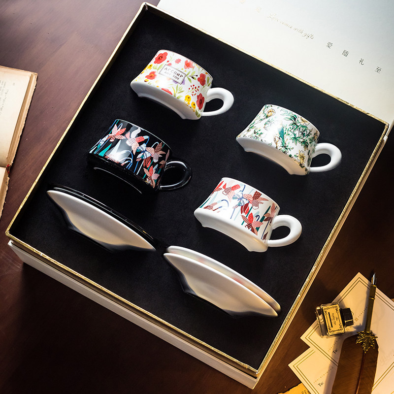 法式轻奢高档彩盒送女朋友礼物水彩画撞色花卉咖啡杯花茶杯情侣杯