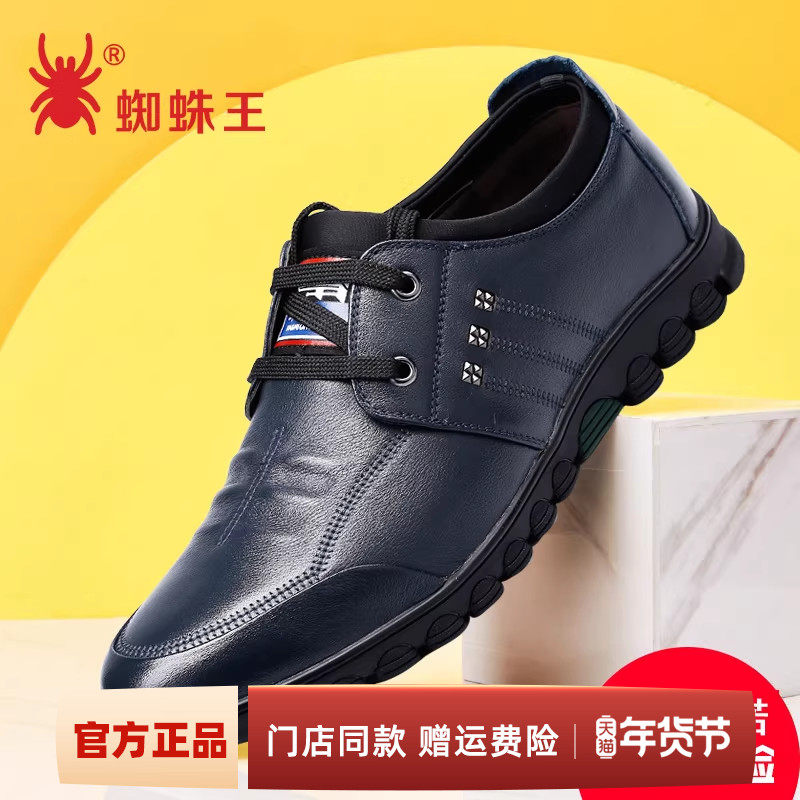 蜘蛛王男鞋休闲春季新款真皮透气男士皮鞋百搭系带圆头黑色鞋子男