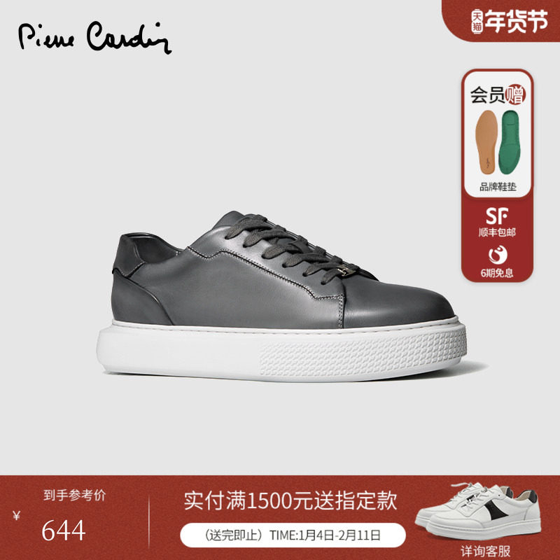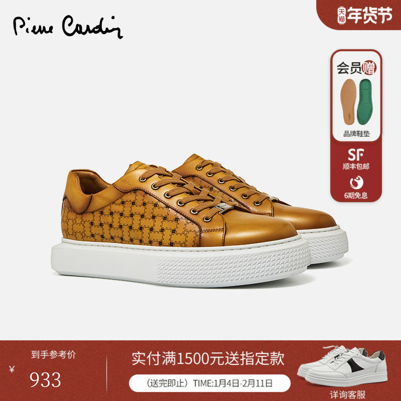 皮尔卡丹男鞋休闲百搭真皮厚底擦色系带格纹圆头板鞋透气休闲鞋男