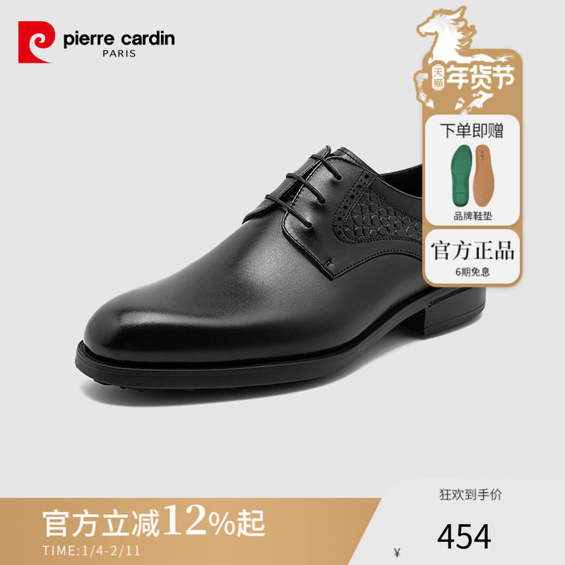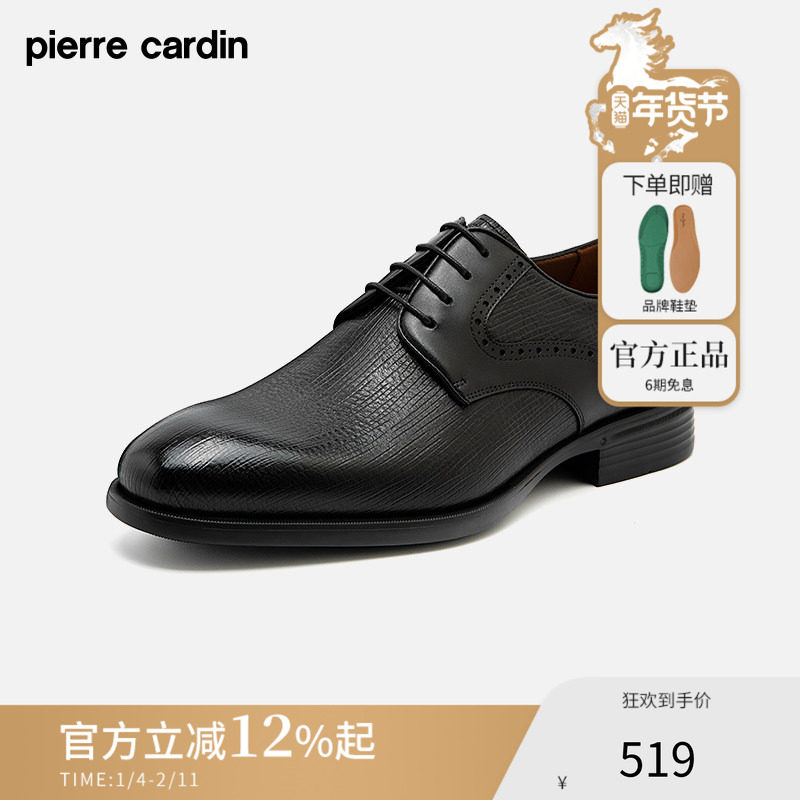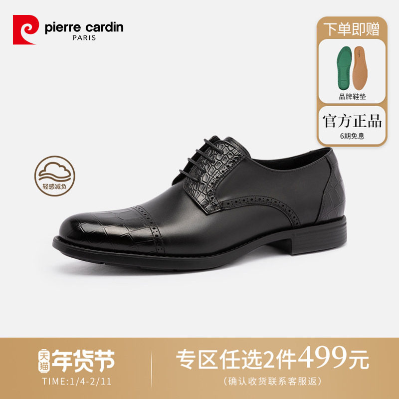 皮尔卡丹男鞋商务正装圆头细线真皮系带缓震欧美平跟皮鞋德比鞋男