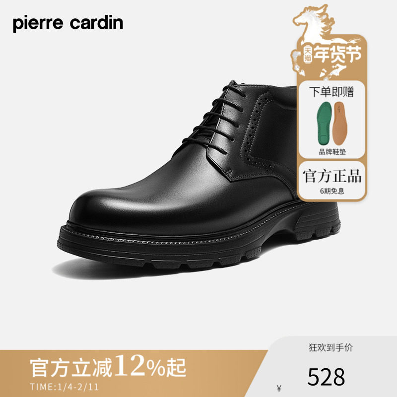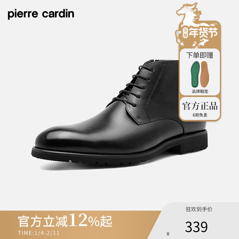皮尔卡丹男鞋商务正装系带真皮皮鞋高帮加绒保暖耐磨圆头靴子男靴