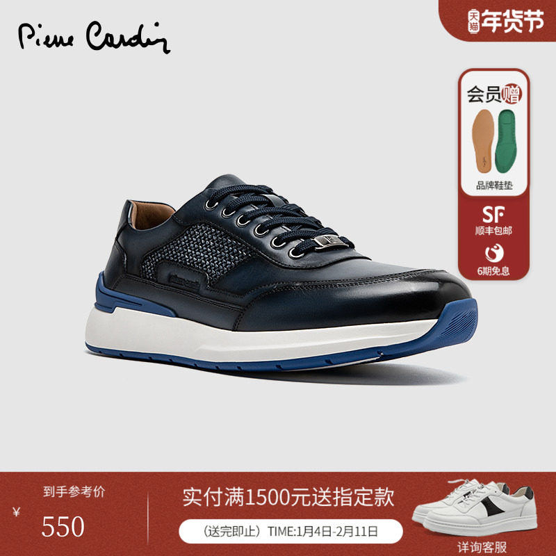 皮尔卡丹男鞋真皮拼接草编羊皮内里舒适透气系带缓震圆头休闲鞋男