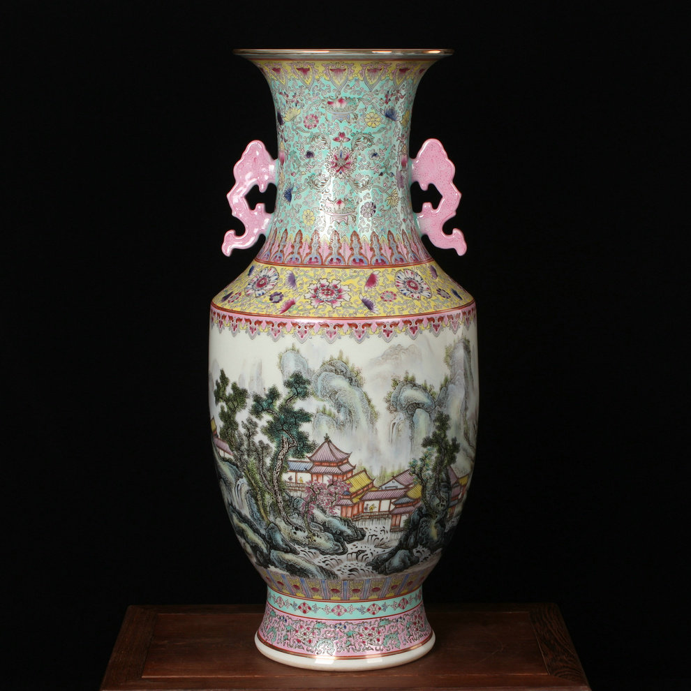 景德镇陶瓷器 仿古手绘粉彩厂货山水描金金钟大瓶 古典家居装饰品