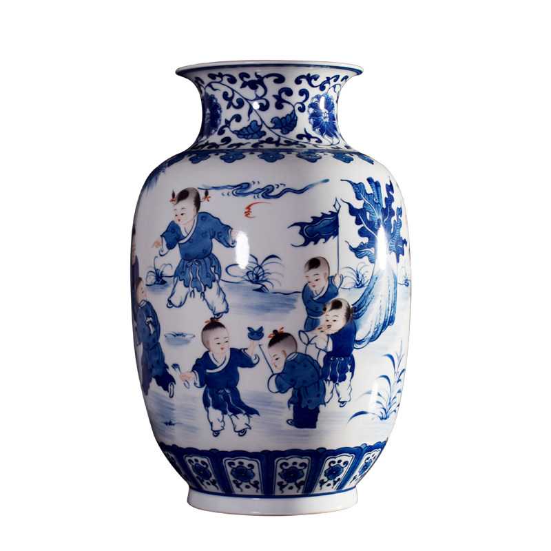 景德镇陶瓷器 仿古青花瓷婴戏图花瓶花插 博古架桌面摆件家居饰品