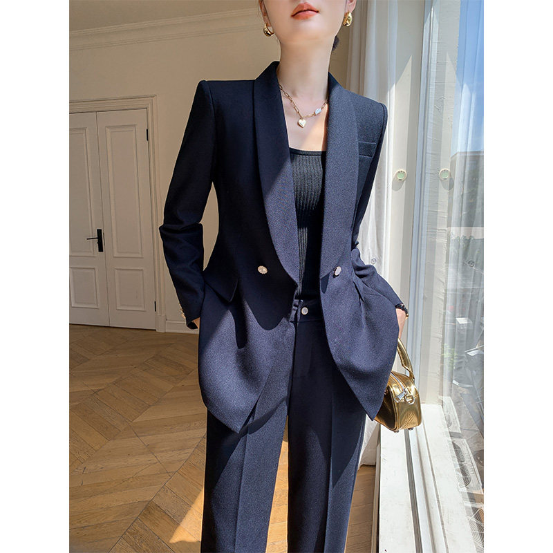 春秋冬新款藏青色西装上衣外套大气职业正装帅气西服直筒裤套装女