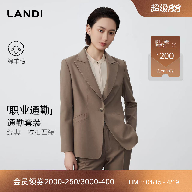 [职业通勤]LANDI蓝地卡其色绵羊毛收腰西装外套女套装秋冬新品