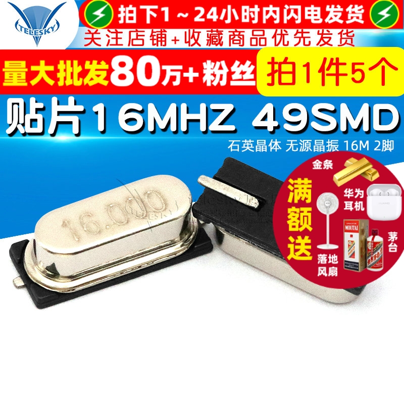 TELESKY 贴片晶振 16M 2脚 16MHZ 49SMD 石英晶体 无源晶振 (5个)