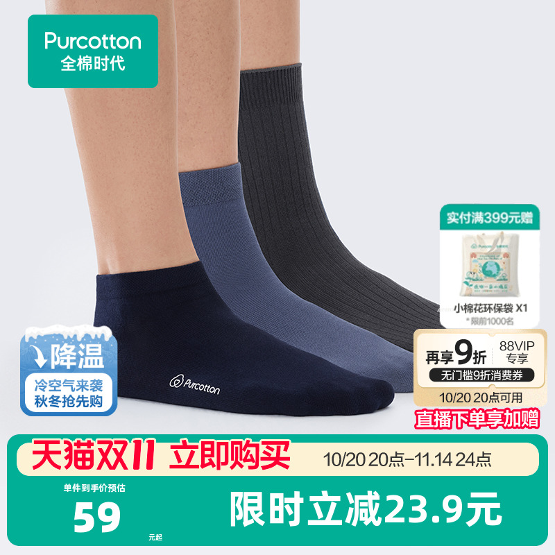 全棉时代袜子男士秋冬中筒长筒纯棉袜子5A抗菌吸汗运动短袜透气男