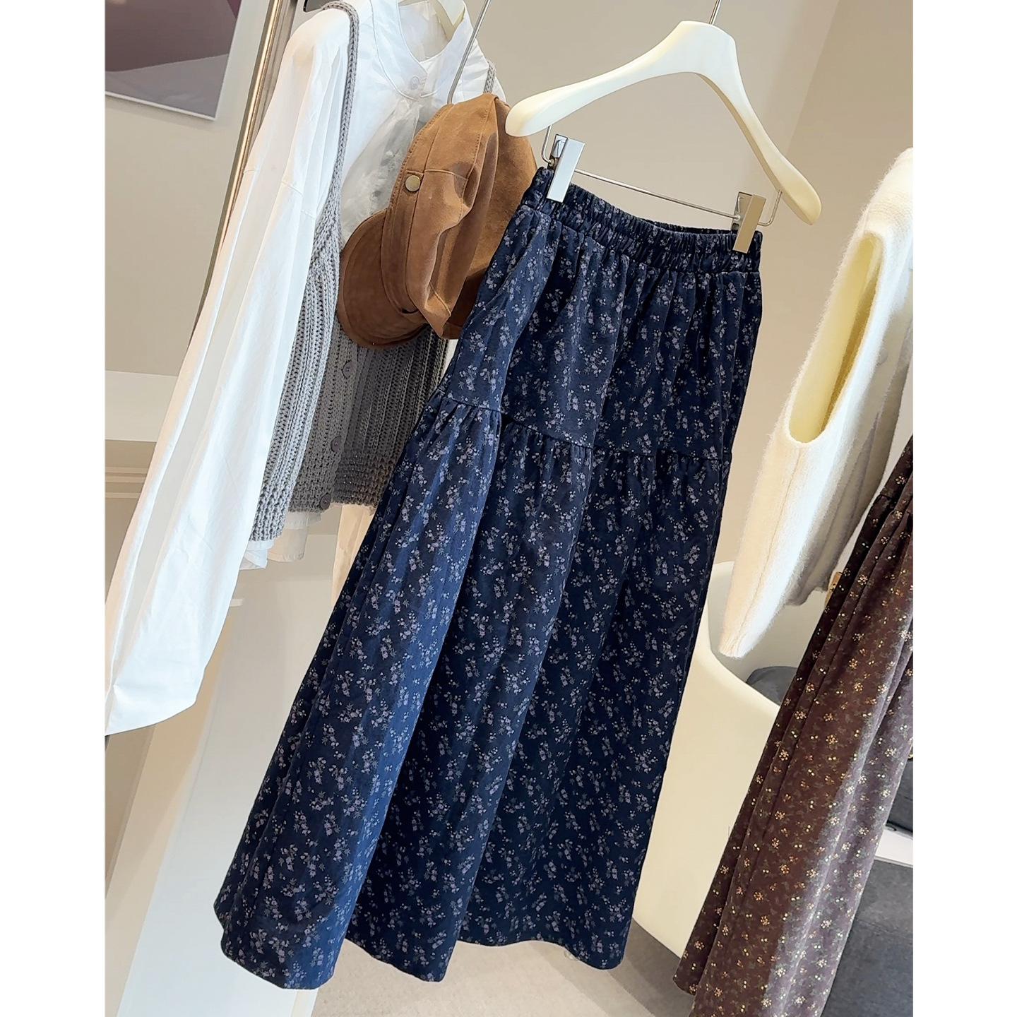 9963 油画风碎花灯芯绒半身裙秋冬女中长款高腰新款a字裙小个子
